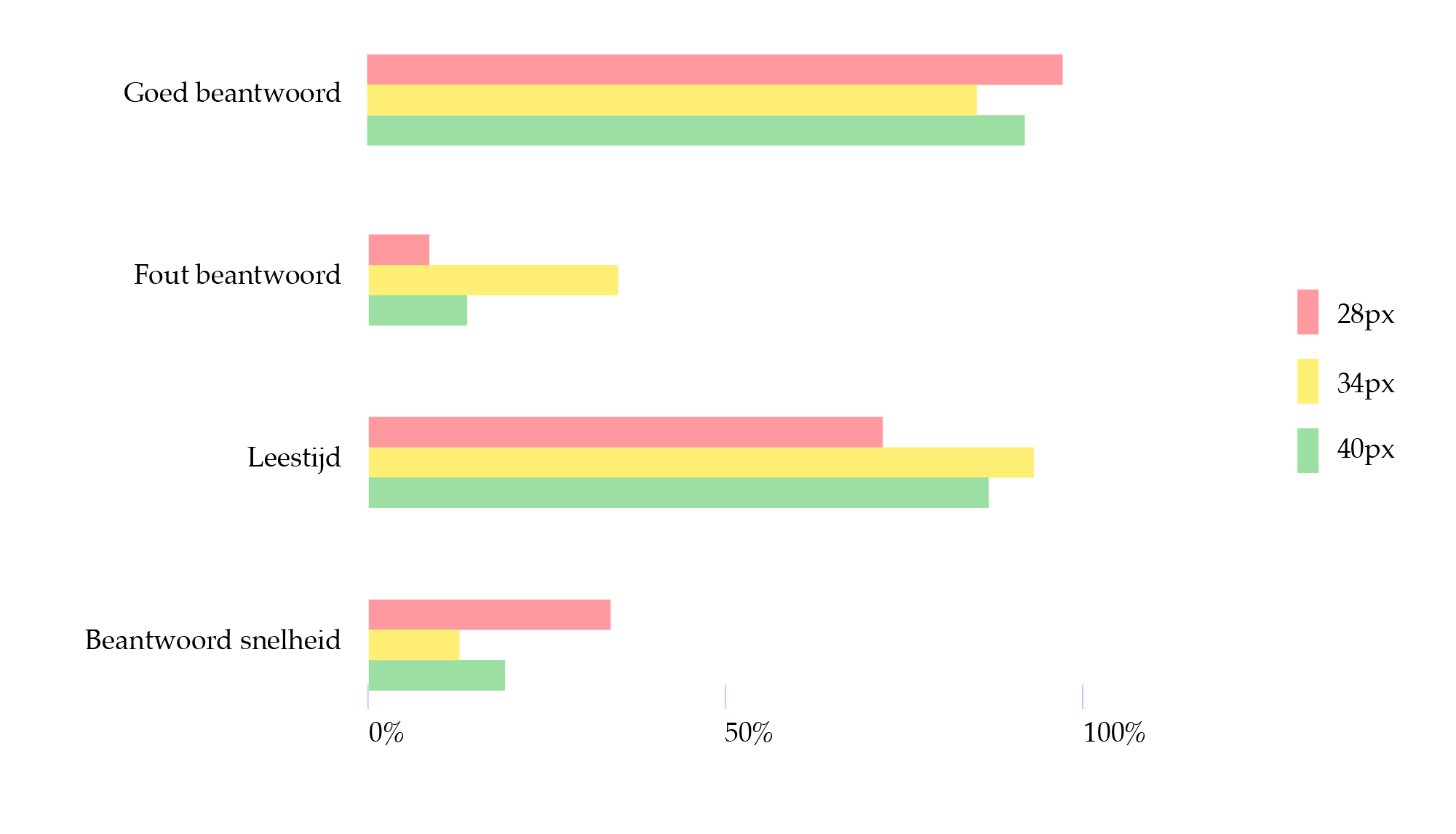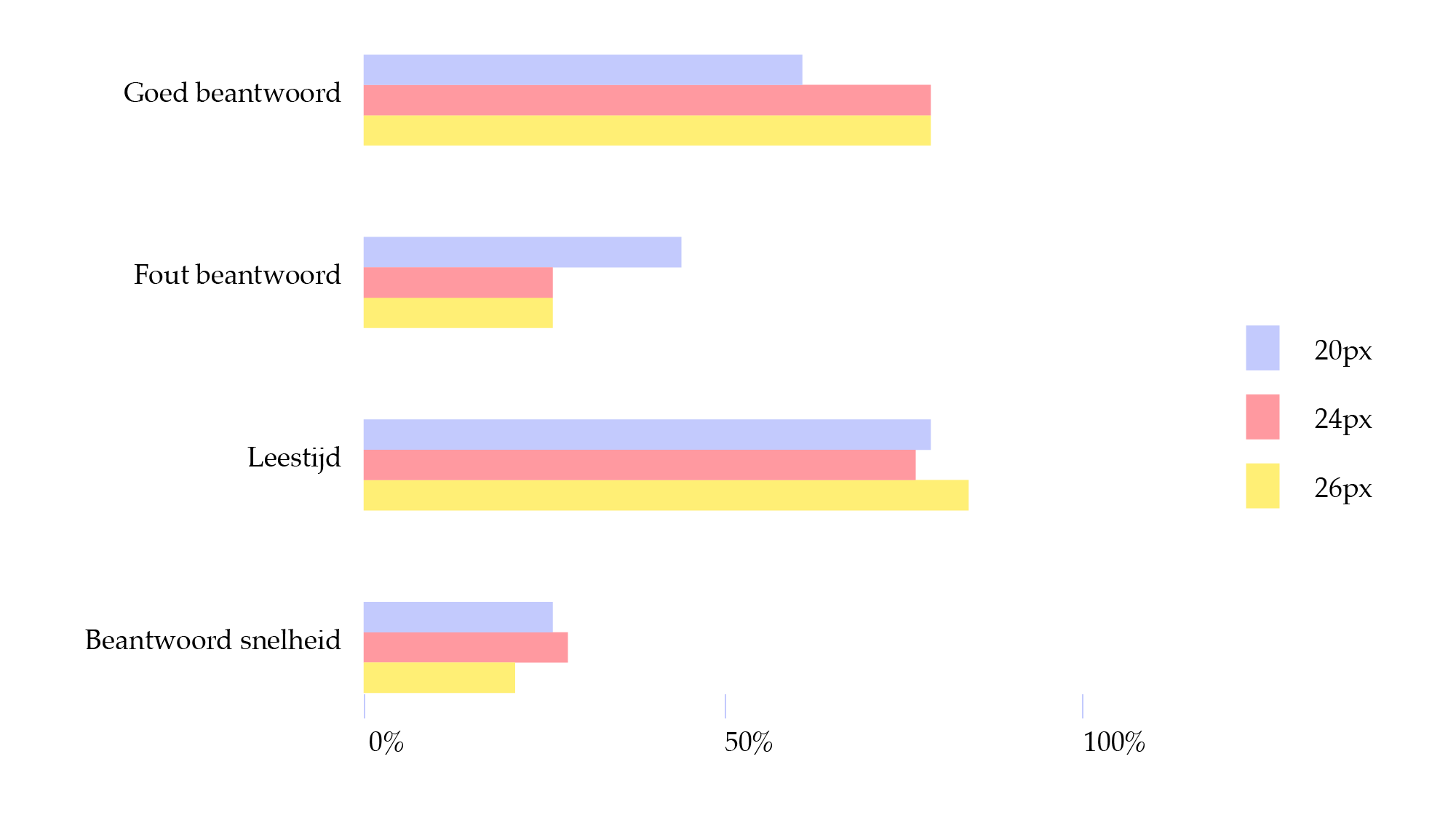 Uit dit onderzoek naar de leesbaarheid is het volgende resultaat gekomen. De schreef letter heeft maar met een minimale voorsprong gewonnen van de schreefloze letter. 24px is het snelste leesbaar en waren hierbij ook de meeste antwoorden goed. 28px is de beste regelafstand. De resultaten zijn ook doorgevoerd in deze longread.