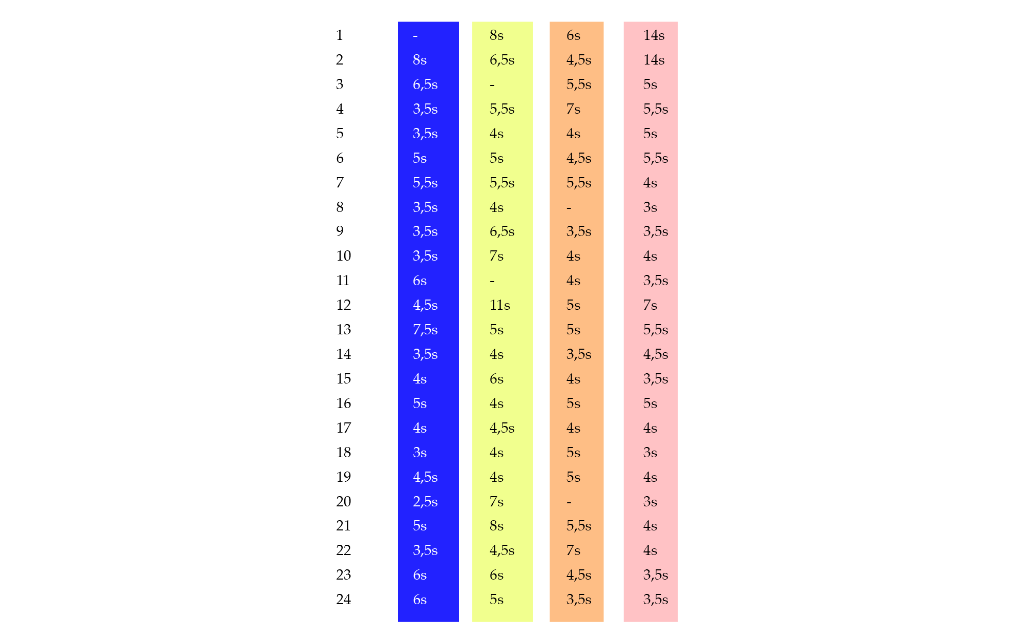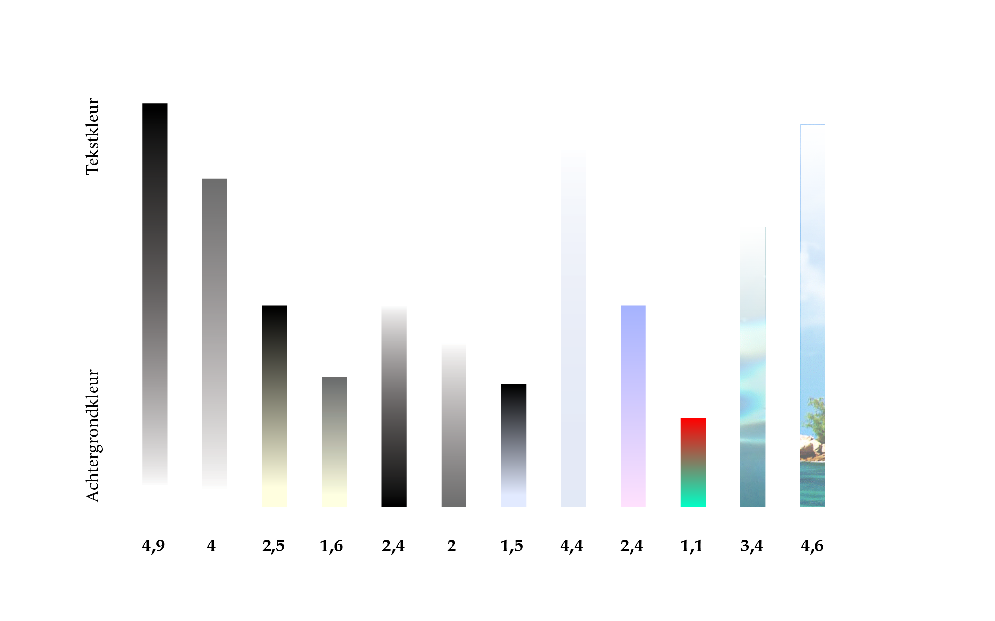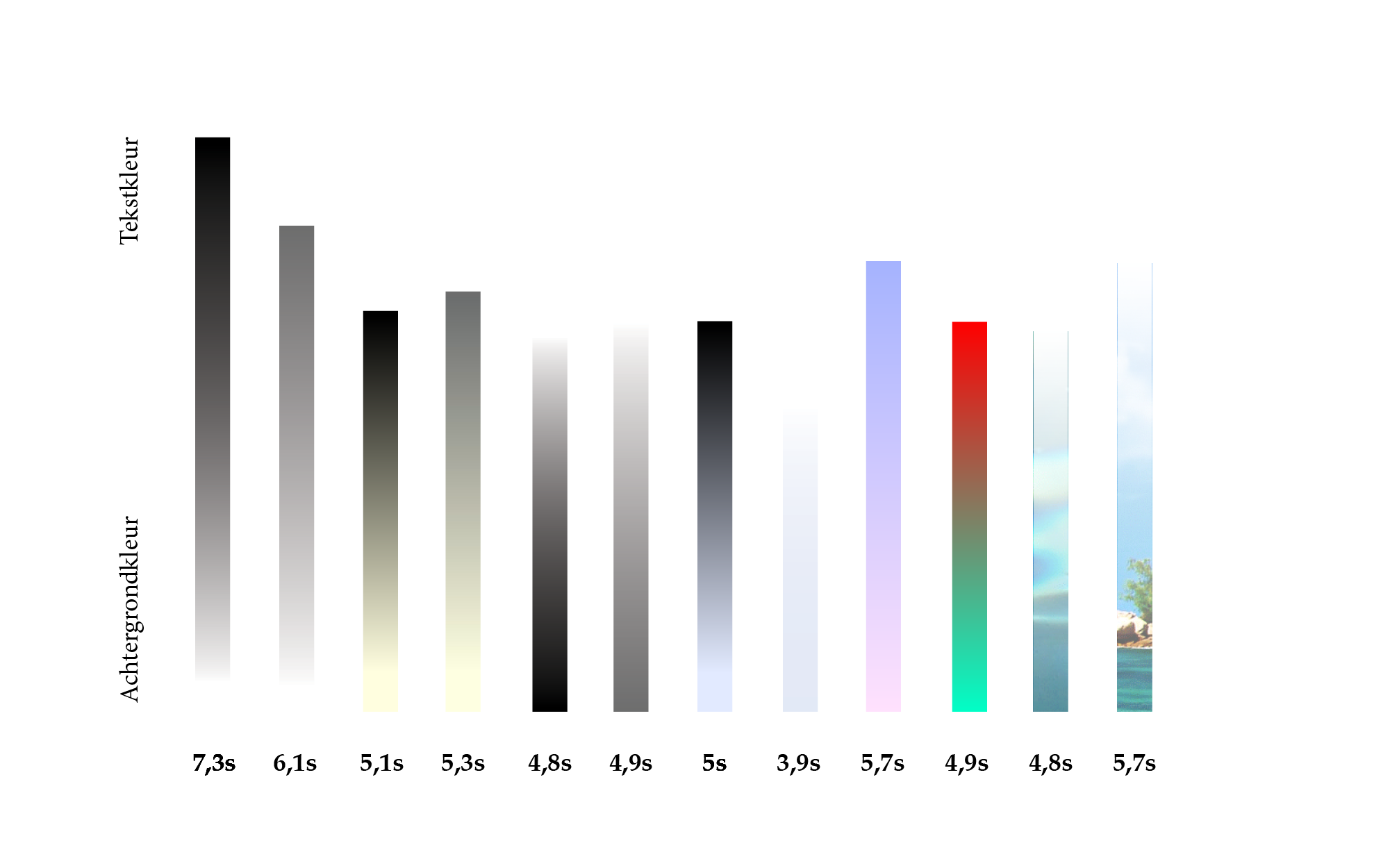 Verbazingwekkend genoeg komt de combinatie van de felle complementaire kleuren als beste uit de test. Waarschijnlijk ligt dit aan het feit dat het effect van een tegenovergestelde voorgrond bij kleur beter wordt opgenomen vanwege de vloekende werking in vergelijking met bijvoorbeeld zwart op wit. De reden dat zwart op wit zo relatief slecht heeft gescoord kan ook liggen aan het feit dat de testpersonen nog niet gewend waren aan de manier van testen.